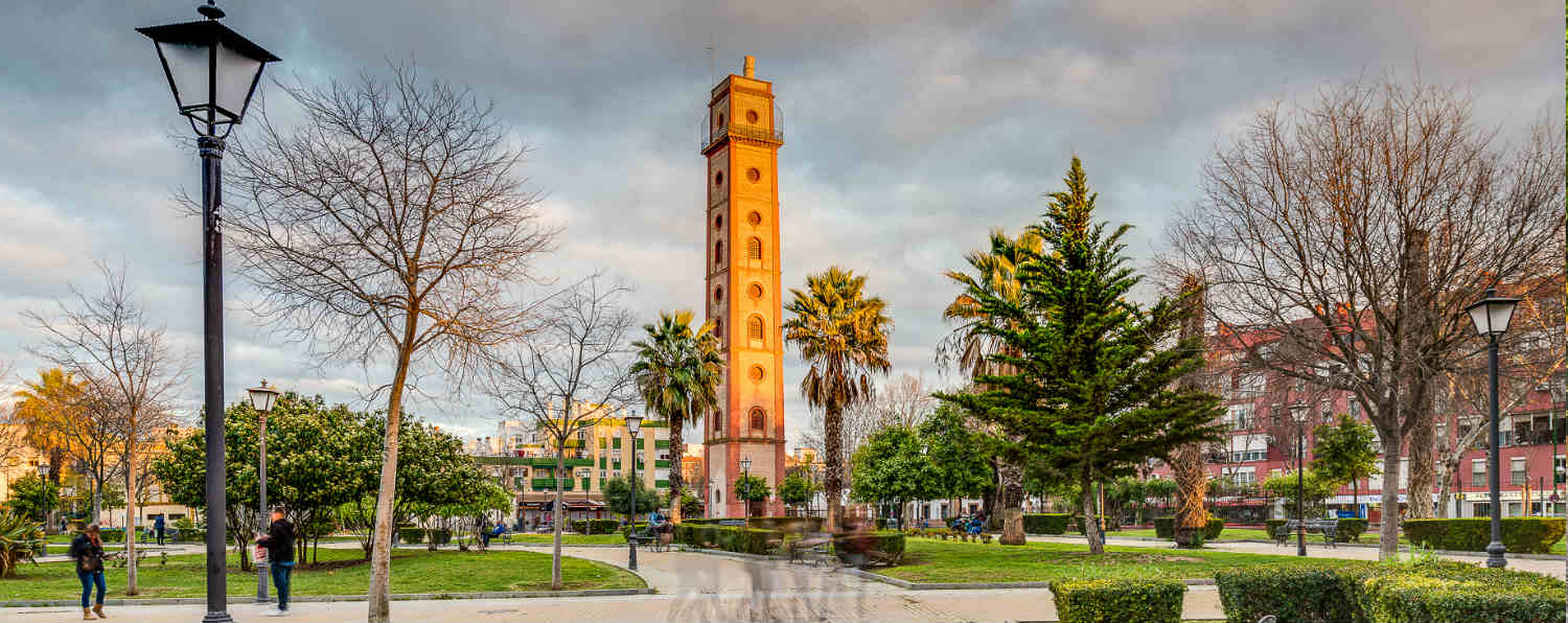 El Jardín Torre de los Perdigones toma su nombre de la llamada “Torre de los Perdigones”, una meritoria y singular muestra de la arquitectura industrial sevillana de finales del siglo XIX que formaba parte de la antigua Fundición de San Francisco, dedicada a la fabricación de perdigones, balas, ladrillos refractarios y otros productos de la cual sólo ha sobrevivido la torre, que, tras su rehabilitación, ha quedado incluida en el interior del nuevo recinto ajardinado. Construida en ladrillo, tiene casi cuarenta y tres metros de altura con trece pisos que se manifiestan al exterior mediante seis cuerpos, todos de planta cuadrada, con ventanas y separados por cornisas molduradas. Fue cuidadosamente restaurada a finales de 1992 por el ayuntamiento de la ciudad con el patrocinio de unos grandes almacenes. Una vez terminada la rehabilitación,mediante el plan especial de reforma interior Resolana-Torne, se reservó todo el área como zona verde ajardinada, abriéndose al público en diciembre de 2002.